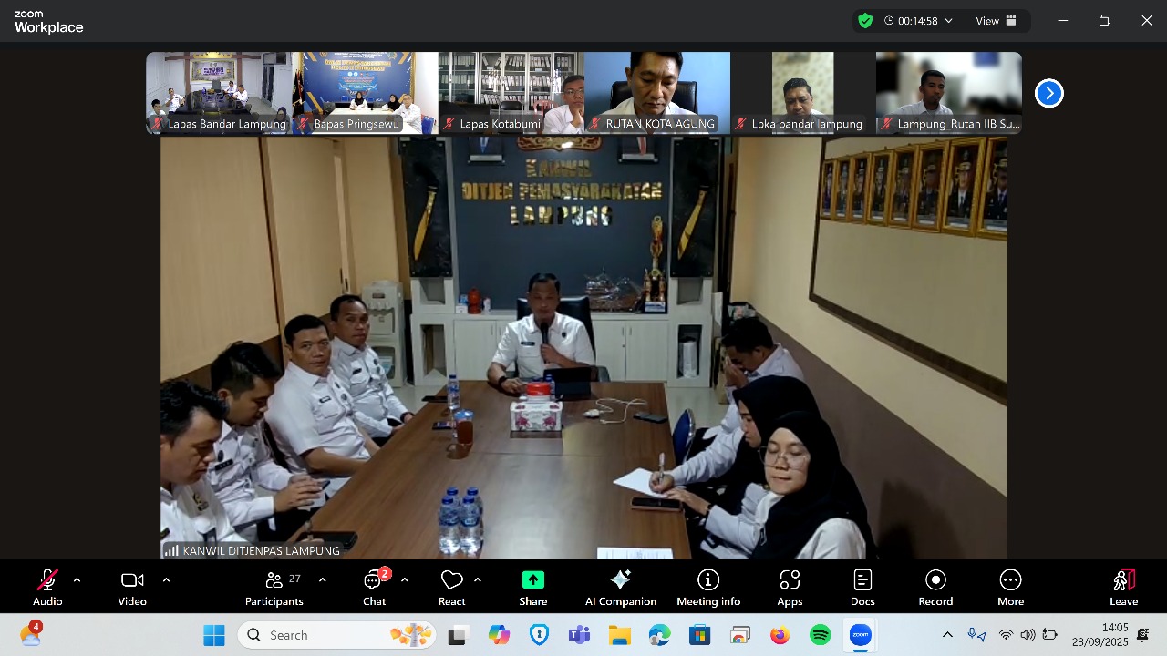 Indonews.web.id, Bandar Lampung, Selasa (23/9) – Tim Pokja WBK (Wilayah Bebas Korupsi) dan WBBM (Wilayah Birokrasi Bersih dan Melayani) Lapas Kelas I Bandar Lampung mengikuti kegiatan Penguatan Kepala Kantor Wilayah dalam rangka pembangunan Zona Integritas, secara virtual melalui platform Zoom Meeting.