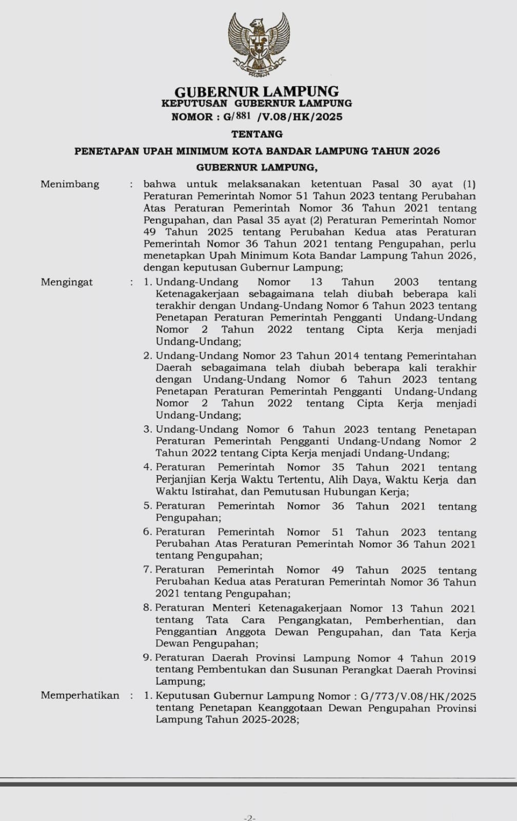 Penetapan tersebut tertuang dalam Keputusan Gubernur Lampung Nomor: G/881/V.08/HK/2025 tentang Penetapan Upah Minimum Kota Bandar Lampung Tahun 2026.