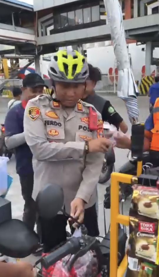 i kendaraan ramah lingkungannya, AKP Ferdo berkeliling menelusuri sudut-sudut pelabuhan untuk membagikan paket takjil gratis kepada para pengemudi truk, penumpang jalan kaki, hingga petugas kebersihan yang sedang bertugas.