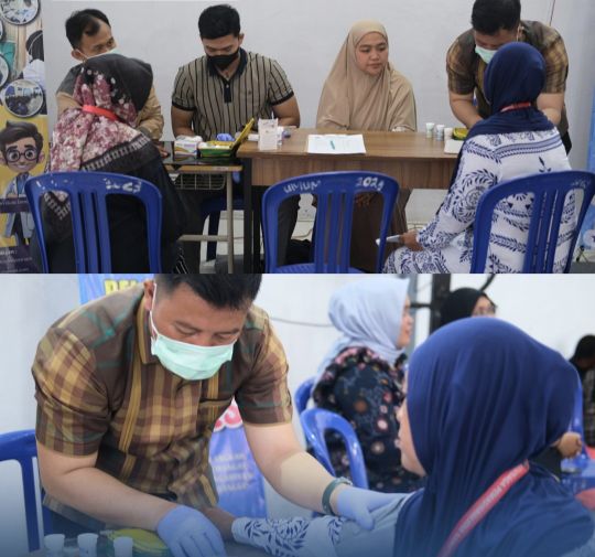 Petugas medis tampak aktif dan sigap melayani setiap pengunjung yang datang ke meja pemeriksaan.